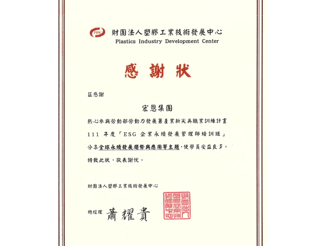 財團法人塑膠中心辦理「111年度ESG企業永續發展管師培訓班」,宏恩集員獲邀擔任課程第一天的企業講師,以超過42年的廢塑膠再利用專業與內部永續管理推動經驗,講述國際永續發展趨勢與再生料產業應用案例。