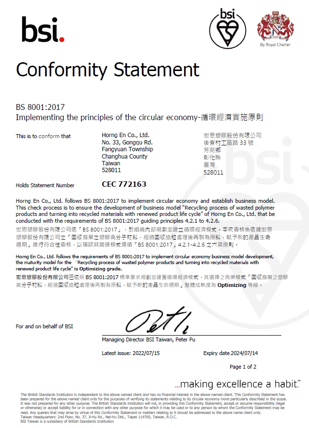 宏恩立基於台灣這片土地,試著改變既有大眾對塑膠產業高污染的形象,盡量落實在地回收廢棄之塑膠高分子材料,經過回收造粒處理後再製為原料,延長並賦予新的產品生命週期,並且透過嚴格控管原料回收來源、確保品質的穩定性,取得GRS全球回收標準、TUV再生料國際認證及UL黃卡,ISO14067產品碳足跡等國際認證,運用資源回收再利用的專業落實友善環境的理念,為環保綠色產品創造永續再生的附加價值。