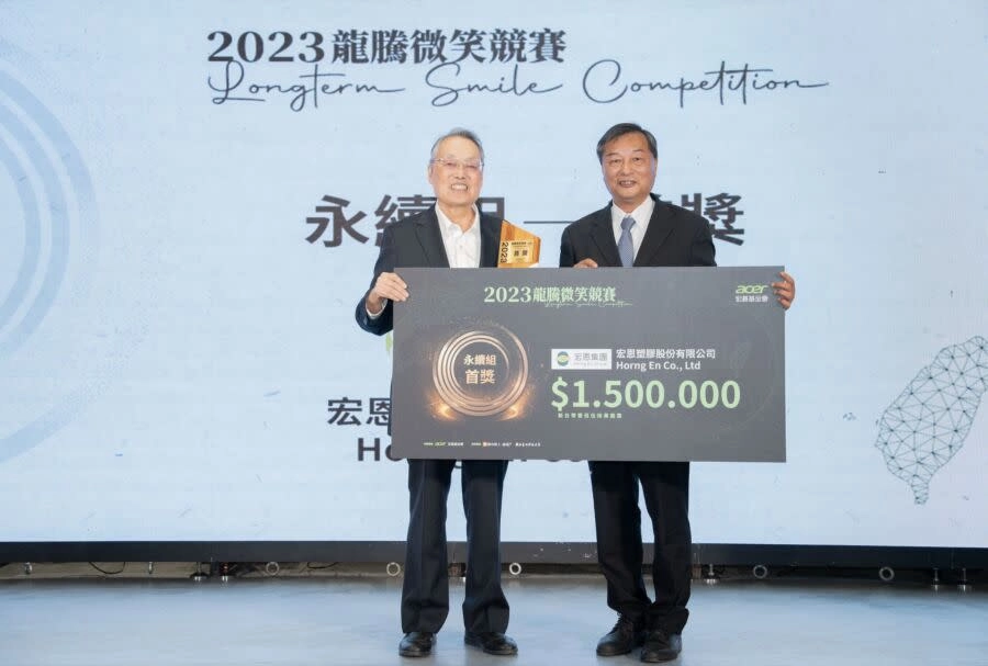 由宏碁電腦與宏碁基金會主辦的「龍騰微笑競賽」自1987年啟動,是實踐社會責任的核心計畫,希望藉由資源傳承將新生代傑出品牌推上國際舞台,打造更多「隱形冠軍」與「台灣之光」,並促進產業共好共榮,為社會注入一股正向力量。今年(2023)競賽活動區分為國際組與永續組兩個類別,共有53家頂尖品牌隊伍報名參賽,歷經9個月的評選審查與訪視,宏恩在永續組中,藉由客制化且極大量的塑膠再生循環商業模式以及卓越的再生料減碳效益等成就脫穎而出,一舉拿下永續組首獎殊榮,證明了低碳循環仍是未來全球永續發展的正確道路,更堅定了宏恩這四十年來一本初衷在塑膠回收循環的信念!